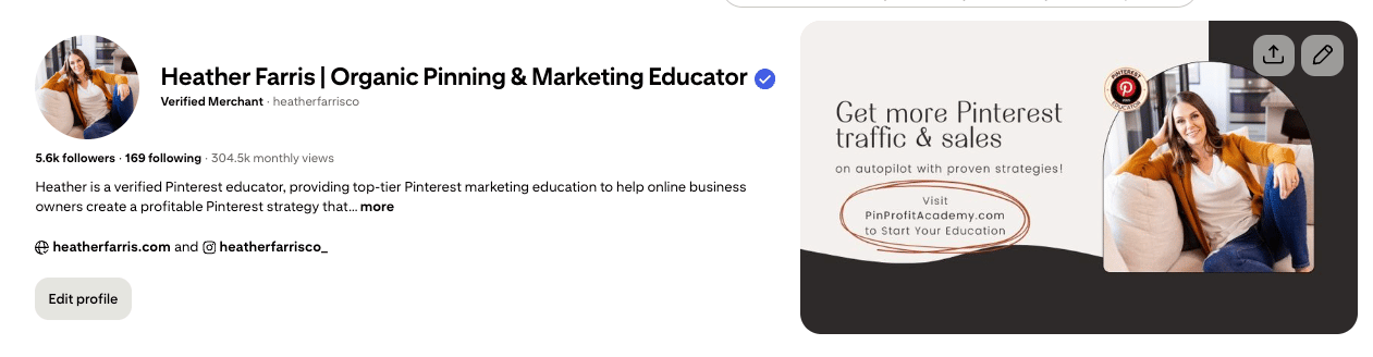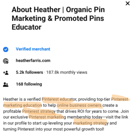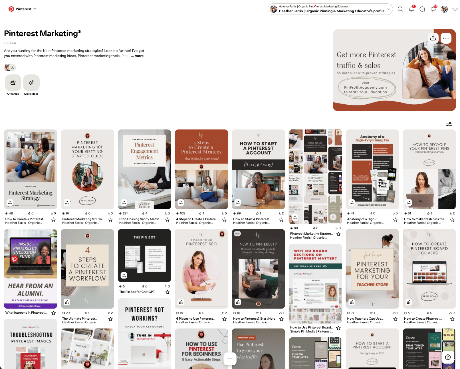 Hey Reader, If you’re starting fresh with a new Pinterest account (or rebuilding one that hasn’t been working), you don’t need to overthink it. There are five core parts of your Pinterest profile that matter most when it comes to strategy—and getting these right sets the stage for long-term growth: This is searchable, which means you want to include your name or brand + one keyword phrase about what you do. Example: Heather | Heather Farris | Organic Pinning & Marketing Educator The key here is to include a main keyword you want to be known for in your industry that people will search for and your name will come up in the search bar results. 2. BioYour bio should make it instantly clear who you help and what they’ll find from you while using long-tail keywords your audience might be searching for. You get 500 characters -- make them count. Avoid putting hashtags or links in the bio section. 3. BoardsBoards act like content categories. Think of them as the pillars of your content strategy, and make sure every board has a clear focus, title, and optimized description. Make sure to fully fill out the 500 character description for the board and avoid putting hashtags and links here as well. This adds personality and professionalism. Use it to visually showcase what your brand is about, highlight key offers, or set the tone for your account. This is the banner at the top of your profile. It behaves like a billboard for your business so people who hit your profile can very quickly see what you do and offer. 5. Board Covers (optional)Totally not required but adding clean, branded covers can improve user experience and make your profile feel more cohesive and intentional. I like to use board covers in most niches because they offer a glimpse at what the profile is about. without having to wonder what is beyond the ellipses. I also have another reason for using board covers... they tend to perform exceedingly well for standalone Pins that stop the scroll. Right now I have 2 board covers as top Pins for engagement in the last 30 days. These little things perform because they're abnormal. Sometimes less is more. If you’re looking for a walkthrough to get everything set up properly (with strategy in mind), I’ve got you covered. Here’s my step-by-step Pinterest setup guide that breaks it all down in plain language. Whether you’re brand new or just rebuilding from scratch, this guide will help you do it the right way—so your content can actually be found. Happy pinning, P.S. I am revamping The Pinterest Roadmap and releasing 3.0 in the coming months. If you have bought it in the past or join the membership before it's released you'll get the update as well. |